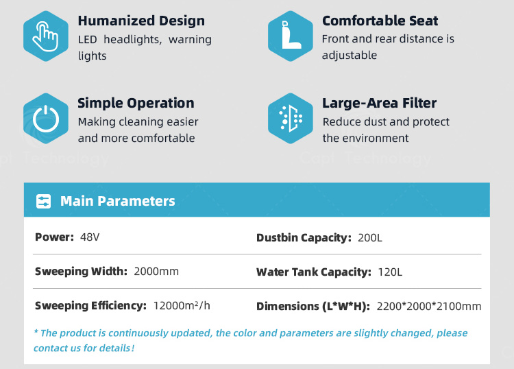 It is a relatively popular sweeper has high cleaning efficiency of vacuum, sweeping and watering. Designed with enlarged chassis, the sweeping width is 2000mm, which offers high work efficiency. Use of high-performance maintenance-free batteries, featured by no leakage and no harmful gases.    The large-capacity dustbin design can clean a larger area at one time, without dumping garbage frequently, and improve work efficiency.