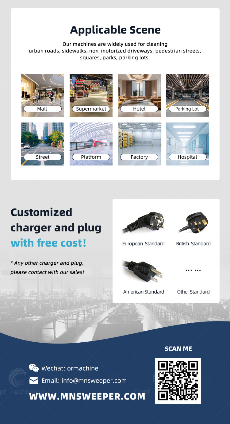 Electric Street Sweeper combined functions of vacuum system, sweeping and water spray. It is good to be used for outdoor cleaning, such as park, sanitation, cleaning company, property management company, square and university.