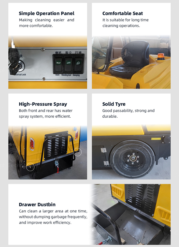 It is a relatively popular sweeper has high cleaning efficiency of vacuum, sweeping and watering. Designed with enlarged chassis, the sweeping width is 2000mm, which offers high work efficiency. Use of high-performance maintenance-free batteries, featured by no leakage and no harmful gases.