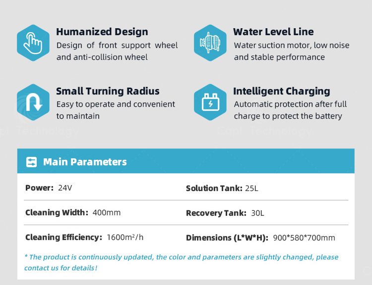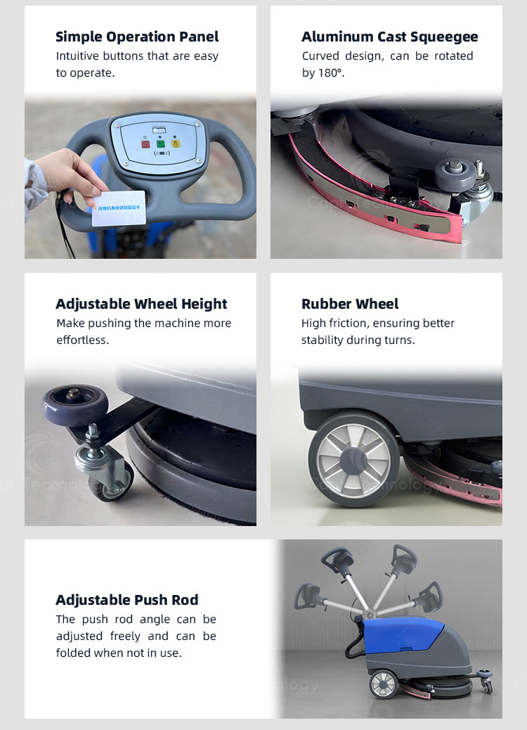 It is an ergonomically designed hand-push scrubber, it is stylish and practical, easy to operate and low maintenance. The ground cleaning can be completed cleaning quickly during the use process, and the sewage can be automatically recovered at the same time of cleaning, realizing a practical and quick cleaning effect.