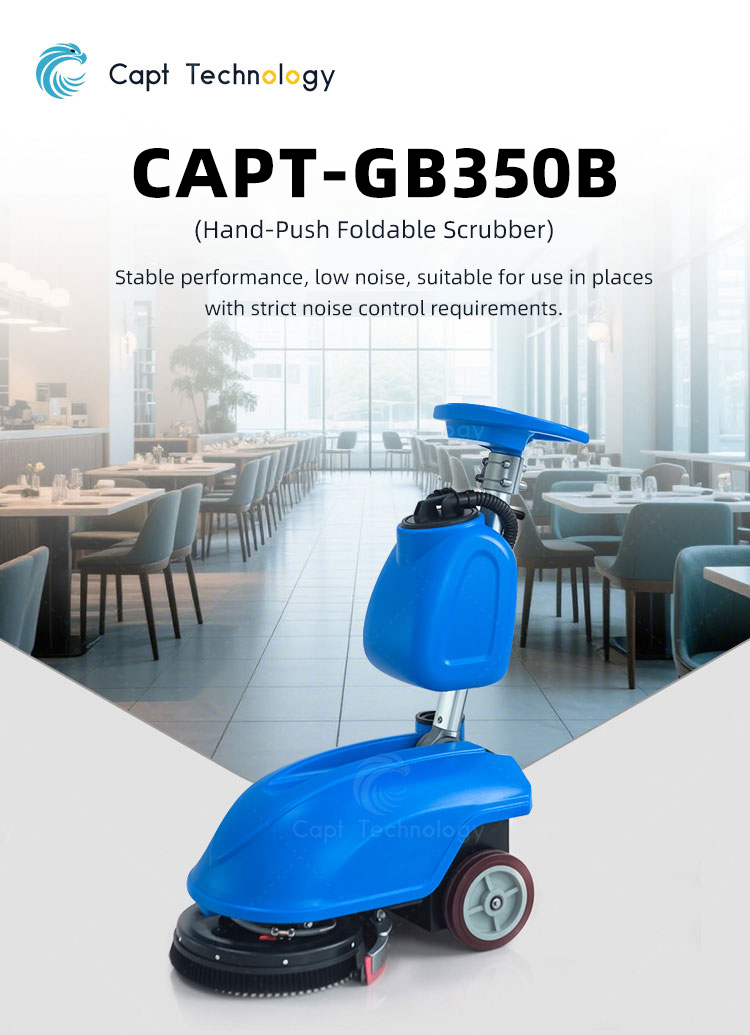 This scrubber is suitable for cleaning flat surface. It uses a 14-inch brush or pad holder to clean the floor. The dirty water is sucked into the sewage tank by the suction scraper behind the machine.