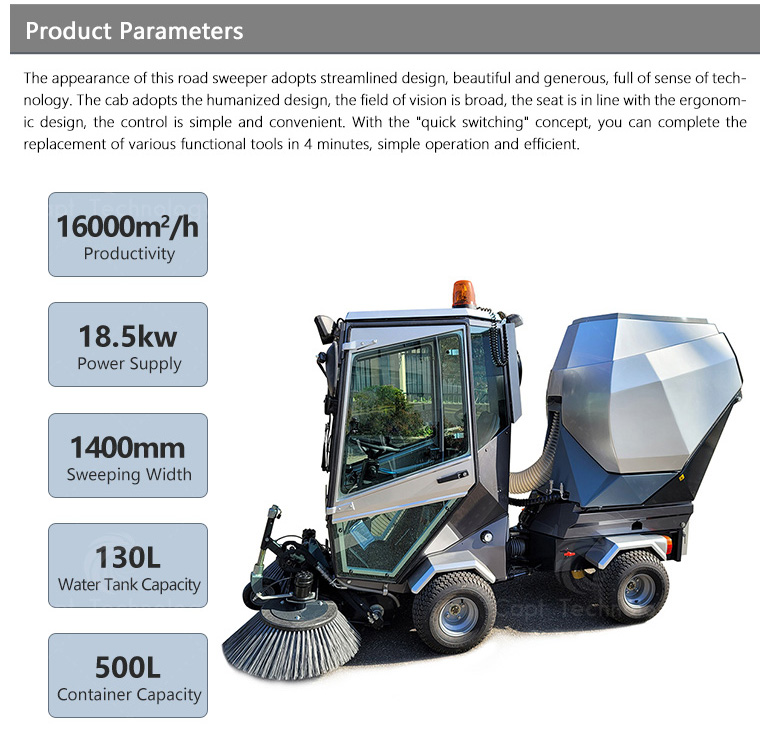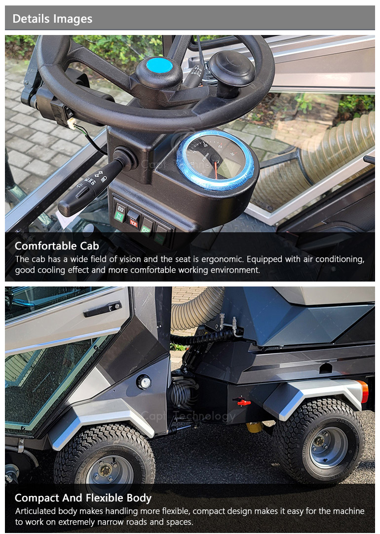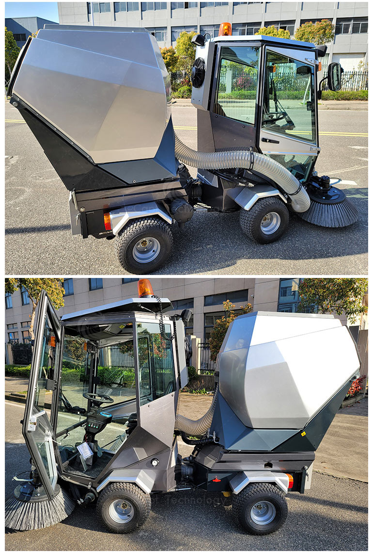 It’s widely used in cleaning work of urban roads, sidewalks, non-motorized roads, pedestrian streets, squares, parks, parking lots and other places. Especially suitable for narrow curved road cleaning. Streamlined appearance, beautiful and generous, full of technology.